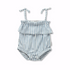 Een luchtige denimblauwe romper met ruchesdetail en strikbandjes. Gemaakt van 97% biologisch katoen en 3% elastaan, voor comfortabel draagcomfort met een speelse pasvorm voor alledaagse avonturen. Makkelijk, licht en schattig.
