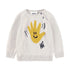 Beige gebreide trui voor de kleintjes, gemaakt van een zachte mix van katoen en wol met lachende handjes op de voor- en achterkant.