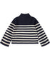 Coole coltrui gemaakt van wol. De trui heeft een schouderpas in donkerblauw met strepen in blauw en wit, en een mooie geribde kraag.