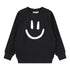 De sweater heeft een losse pasvorm en een witte, zachte geborduurde glimlach op de voorkant.