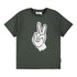 Het T-shirt heeft korte mouwen en een geribde halslijn. Het heeft een losse pasvorm en een print op de voorkant van een hand met een vredesteken.