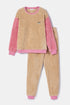 Beige set van teddystof. De set bestaat uit een sweatertrui en broek met rekker. De mouwen, hals en pijpuiteinden zijn roze. Op de sweater staat een kleine print van de kat. De set is verkrijgbaar in de maten 1 tot 8 jaar. Bestaat kleiner en ook voor volwassenen maar niet in de winkel.