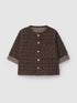 Geruit overhemd van 100% biologisch katoen met dubbele gaasstof en een functionele zak aan de voorkant. De mouwen kunnen worden opgerold of omgeslagen voor extra duurzaamheid. Sluit met doorlopende houten knopen aan de voorkant.