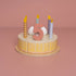 De set bestaat uit 6 stukjes taart op een plateau, een taartschep, donut, macaron, vogel, vlinder, regenboog, kaarsjes, slagroomtoefjes en cijfertoppers (1-5). 26 Stuks.